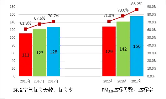 2017年1~6月,杭州市环境空气优良天数累计128天,与2016年同比增加5天,优良率70.7%,同比上升3.1个百分点。杭州市区PM2.5平均浓度50µg/m3,杭州市区PM2.5达标天数156天,达标率86.2%,与2016年同期相比,达标天数增加14天,达标率上升8.2个百分点。与2015年相比,达标天数增加27天,达标率上升14.9个百分点。杭州的PM2.5达标率近三年来呈现逐步上升趋势。